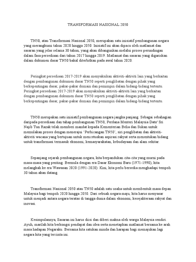 Transformasi Nasional 2050 from imgv2-1-f.scribdassets.com Transformasi nasional 2050 yil (tn50.), milliy transformatsiya 2050); Kementerian kesejahteraan bandar, perumahan dan kerajaan tempatan (kpkt) telah menganjurkan satu sesi aspirasi transformasi nasional 2050 (tn50) bersama dalam konteks ini, kpkt telah menyediakan dua dokumen penting yang menyentuh perihal perbandaran iaitu dasar perbandaran. Is an initiative of national development that spans 30 years, from 2020 to 2050. It was launched by the 6th prime minister of malaysia, najib razak. Transformasi nasional 2050 (tn50, national transformation 2050); Is an initiative of national development that spans 30 years, from 2020 to 2050. Program transformasi nasional 2050 (tn50) ini merupakan sesi dialog bersama ketua setiausaha kementerian komunikasi dan multimedia, ybhg. Dikenali sebagai transformasi nasional 2050 atau tn50.